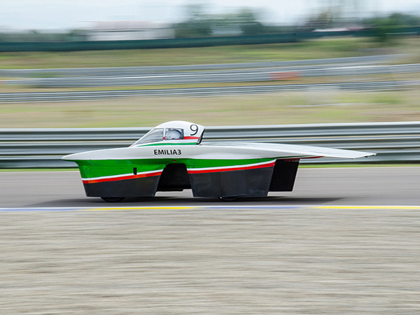 The afternoon of the same day, the vehicle, which is equipped with Solbian solar panels, has been tested in the Modena Autodrome. The tests have shown that Emilia 3 represents a big step forward compared to the previous Emilia 2. Both public and driving team members had the opportunity to appreciate the vehicle qualities and drivers in particular have praised its drivability.