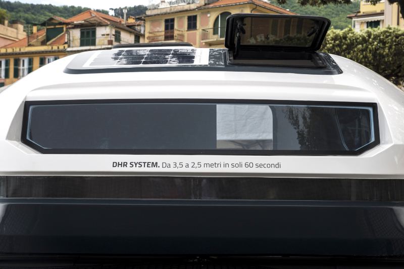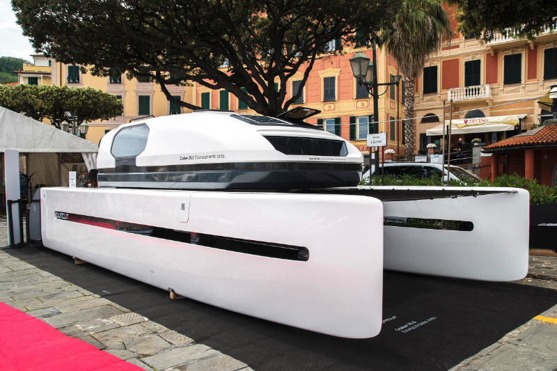 Outcut 29.5 is a towable catamaran with variable width, it’s in fact equipped with a special system (DHR) that reduces the distance between the hulls in the water from 3.5 to 2.5 meters in just 90 seconds. The 2x20 Hp drive system does not require a nautical license, there are no registration requirements and being towable, it’s also free from all port duties and obligations. With a limited draught (just 30 centimeters) and a weight of just 1,400 kilograms Outcut can be equipped with a combustion or electric engine.