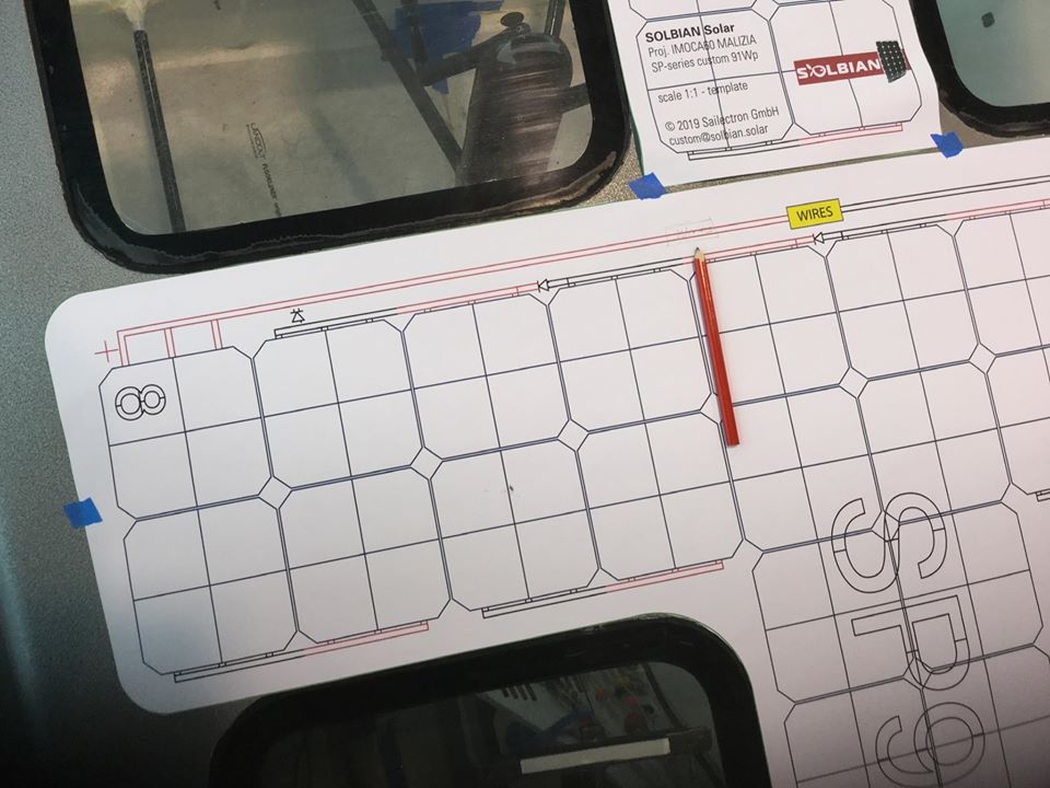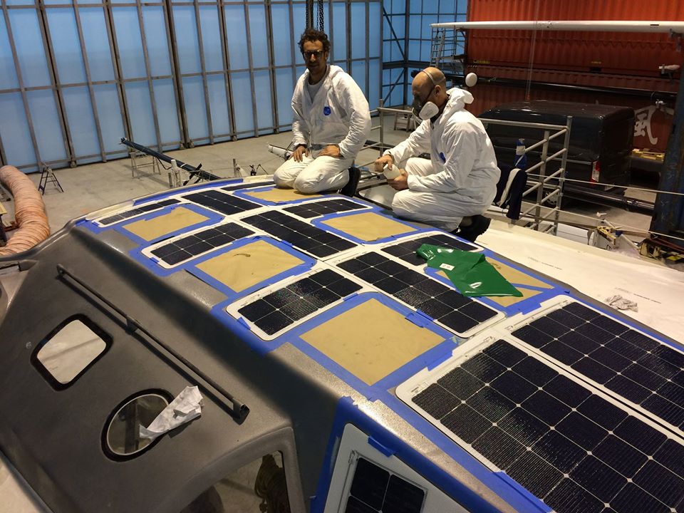 While the solar system and Genasun charge regulators were being manufactured in Italy and the USA, the Malizia crew carefully prepared all surfaces for the installation, removing the non-skid deck finish and stiffening cable feedthrough areas. After delivery, they removed the protective film on the back and used the pre-mounted adhesive to attach the system to the deck surfaces, followed by finishing the edges with UV-resistant sealant.